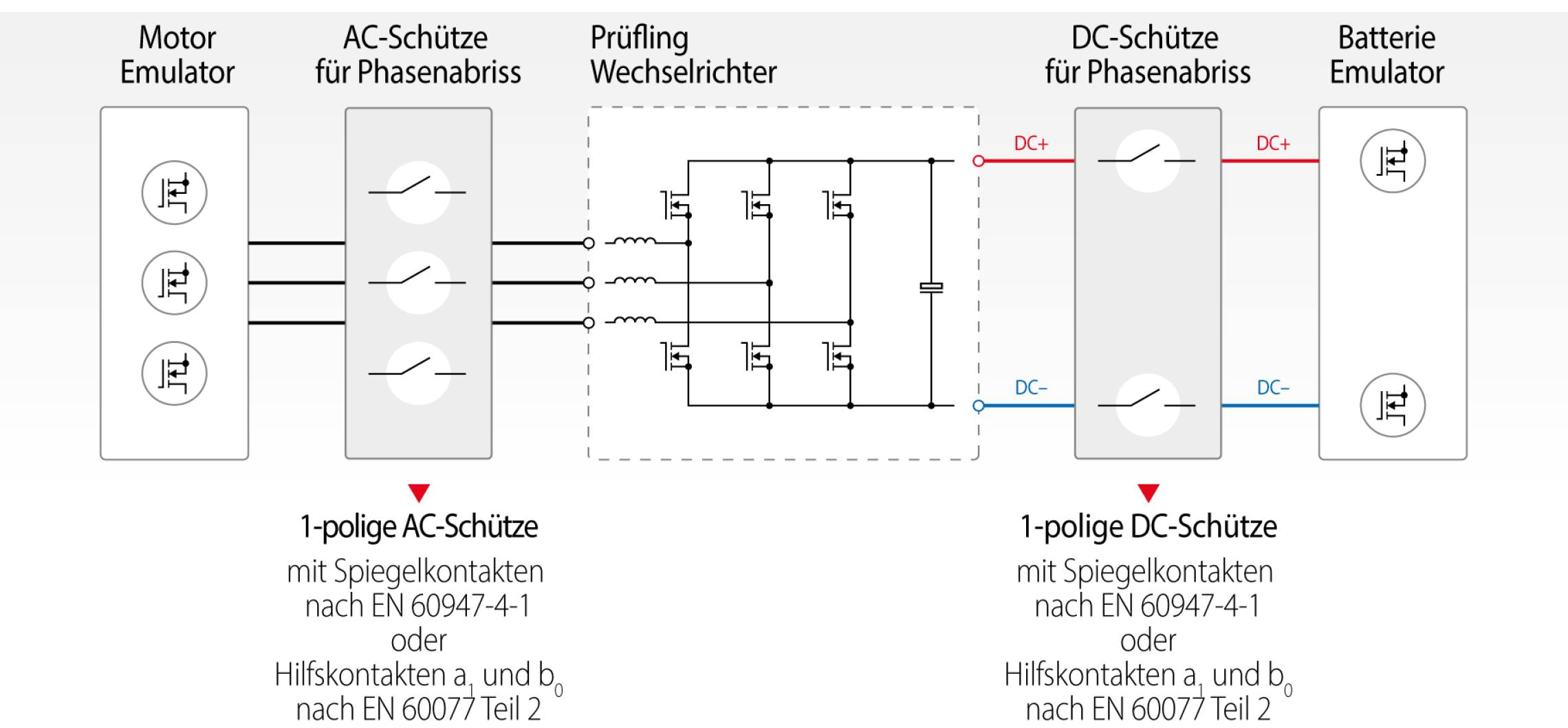 In general, the contactors used in electrical systems are actuated and monitored via programmable logic controllers (PLCs), insofar as they are not in the safety-critical parts of the system. A typical application is a test station for the inverters of electric vehicles. Normally the test piece is supplied by a switchable DC source, that is designed for voltages up to 1000 V DC and rated currents up to 1000 A. The test piece is loaded with either a permanently excited synchronous motor or an emulator. In this case contactors are to reliably disconnect the individual phases from the test piece and load. To ensure the safe disconnection of system and test piece, the mirror contacts are monitored in the feedback circuit. The main component of the feedback circuit is the safety controller, which is implemented with a safety module in smaller systems and with a safety PLC in larger ones. In this application, the safety controller monitors the integrated mirror contacts of the contactors on the primary and secondary side of the test piece. When the test is started, the test chamber is interlocked by appropriate safety technology and is only released again when the feedback circuit receives a message that all contactors have returned to their idle state.