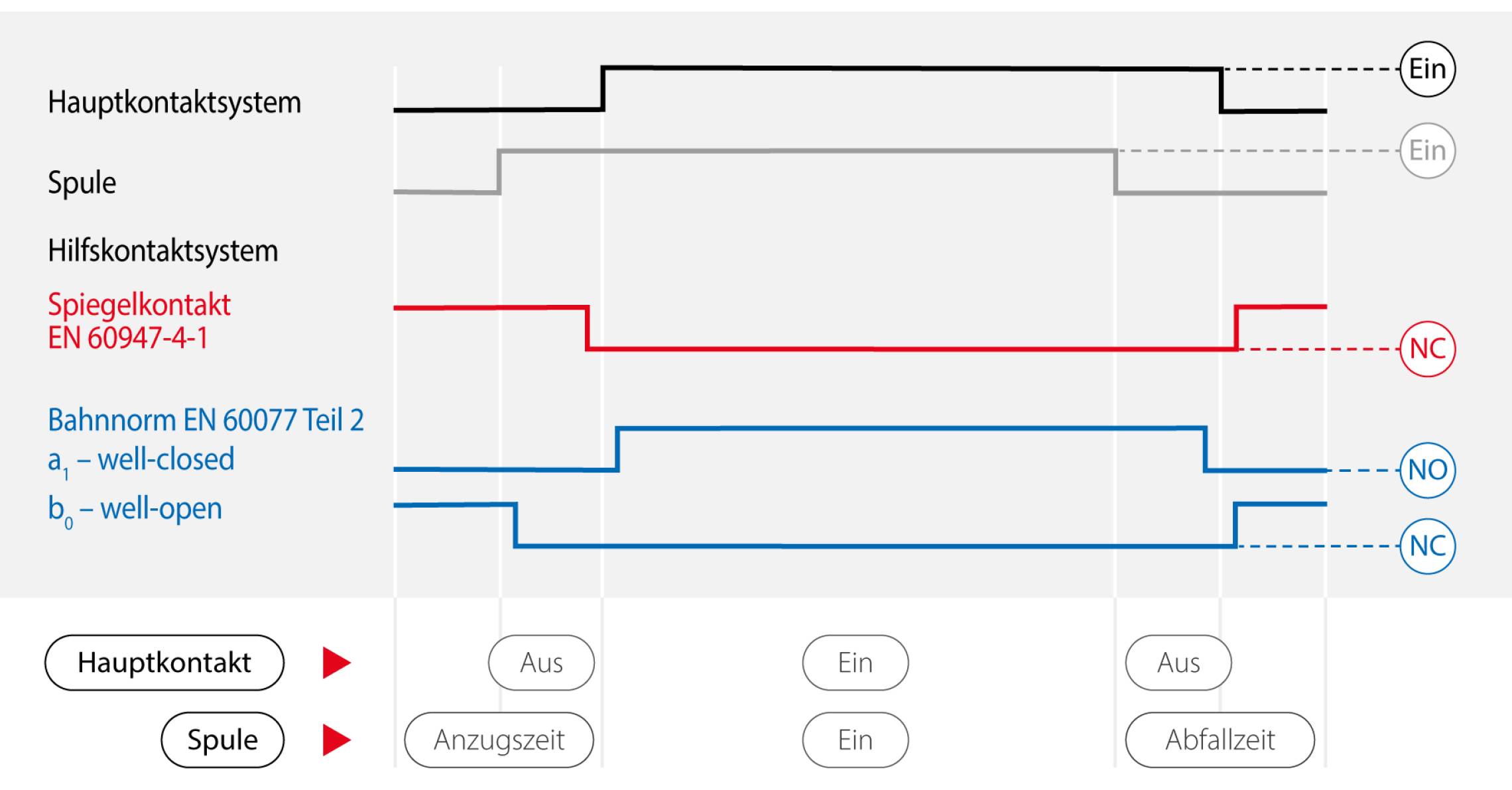 The railway industry has been aware of this problem for some time. Here too, accurate knowledge about the switch state of the contactor is very important. The defining standard EN60077 Part 2 for the railway industry resolves this problem by defining two auxiliary contact types according to the terminology of IE 600050-41. These are an auxiliary NOC a (well-closed) and an auxiliary NCC b (well-opened). These auxiliary switches signal the closing or opening of the main contact. If the contactor remains stuck half open or closed, the controller evaluates that an implausible event has occurred and can thus diagnose an error.