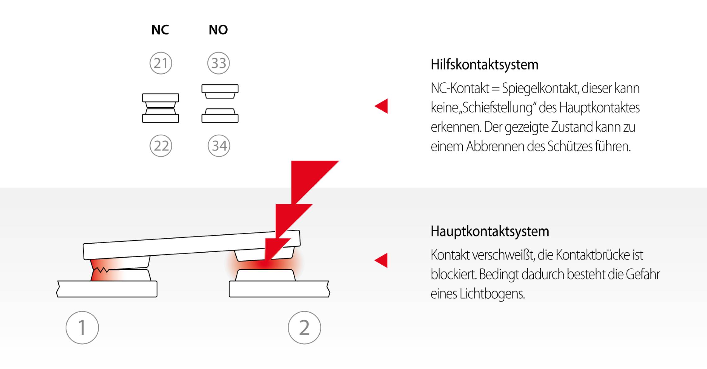 A typical error diagram should clarify the difference. Under unfavourable conditions, it may occur that particles of dust or dirt collect between the main contacts and prevent fault-free closing of the circuit. During closing of the main contacts, the separating distance reduces until there is a sparkover and ignition of an electric arc which is extinguished when the contacts are closed. In general, the electric arc burns off the dirt particles between the contacts, however, melting of the contact material may also occur. Dependent on the extent to which the contacts melt, they can fuse together to a greater or lesser extent. In the case of a single pole contactor with a double contact bridge or a multi-pole contactor, the drive of the main contacts may, as a result, no longer open or close correctly. As a mirror contact can only indicate the “simple” status of the main contacts and not a tilted position, there is a risk of an electric arc while the contacts are only partially open. If the current flow is not interrupted, then the electric arc continues to act, with the result that the contactor burns away.