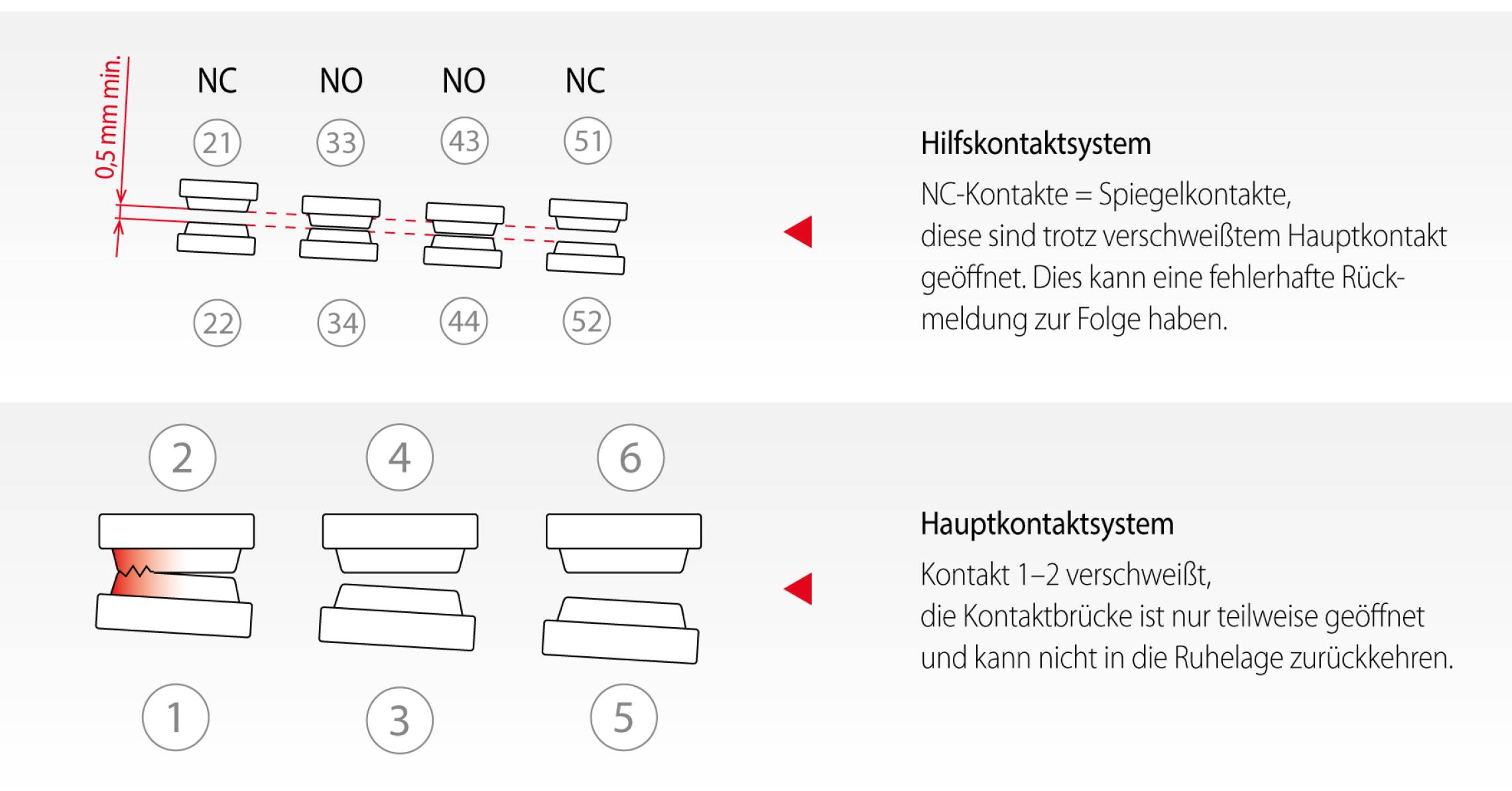 Essentially, a contactor comprises a coil with an armature, the main contact(s) and optional auxiliary contacts, that can be implemented as mirror contacts. If current flows through the coil, the armature is pulled in and the main contacts connected to it are closed. If the auxiliary switches are mechanically connected to the main contacts, then they replicate the status of the main contacts quite accurately. If the auxiliary switch is implemented as an NCC and designed according to the requirements of EN60947-4-1, the contacts are configured as mirror contacts. Direct actuation via the armature is also possible. With this principle, in general, for example, a plunger is fixed to the armature that actuates the auxiliary switch. However, with this type of actuation, incorrect feedback responses of the auxiliary contact can occur. Especially in the case of a fusing together of the contacts, incorrect notifications are effectively pre-programmed as a result of the design. The reason for this is that the armature is moved, together with the actuator, towards the initial position, although the main contacts are in an undefined state. Consequently, this design type is fundamentally not to be recommended and may have fatal consequences for man and machine.