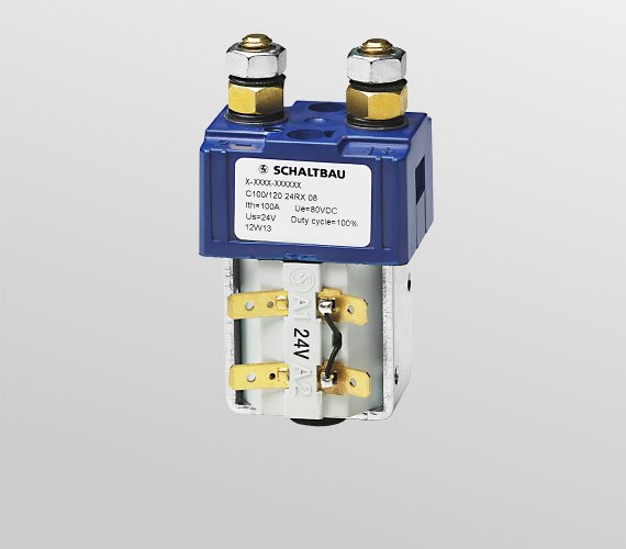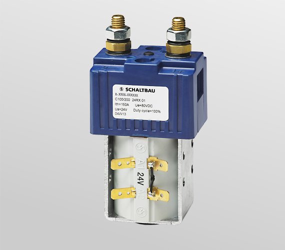 The Schaltbau C100 series stands for configurable single-pole NO contactors for unidirectional switching of battery voltages up to 80 volts (150 volts rated insulation voltage), with four sizes for continuous thermal currents up to 250 amperes.