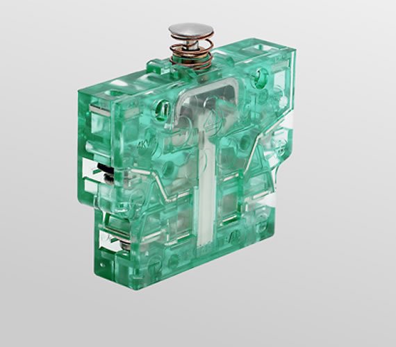 In every switching process, the contact bridges rub in a defined fashion on the V-shaped fixed contacts and remove corrosion and combustion residue. Permanently low contact resistances ensure a high level of contact reliability throughout the service life.